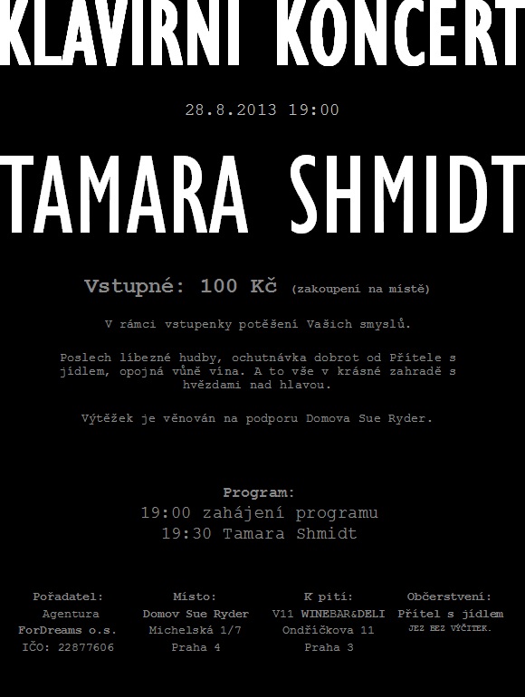 Máte volné středeční odpoledne a nevíte co s ním? Zúčastněte se jedinečného koncertu ukrajinské zpěvačky a klavíristky Tamary Shmidt a podpořte tím dobrou věc.