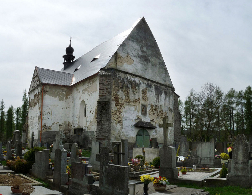 Pochází už z roku 1373 a také na to vypadá – nedávná nepovedená oprava střechy mu moc neprospěla, takže se raději vydáme na hřbitov. Na první pohled jde o obyčejný vesnický hřbitůvek, zeď a kamenný portál, které ho svírají, však pocházejí ze 16. století. Hroby staré i současné se tlačí na sebe a když se zatouláte do jihovýchodní části hřbitova, cítíte plíživé zlo, jež přetrvalo staletí a možná tisíciletí.